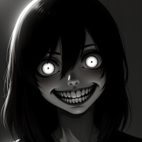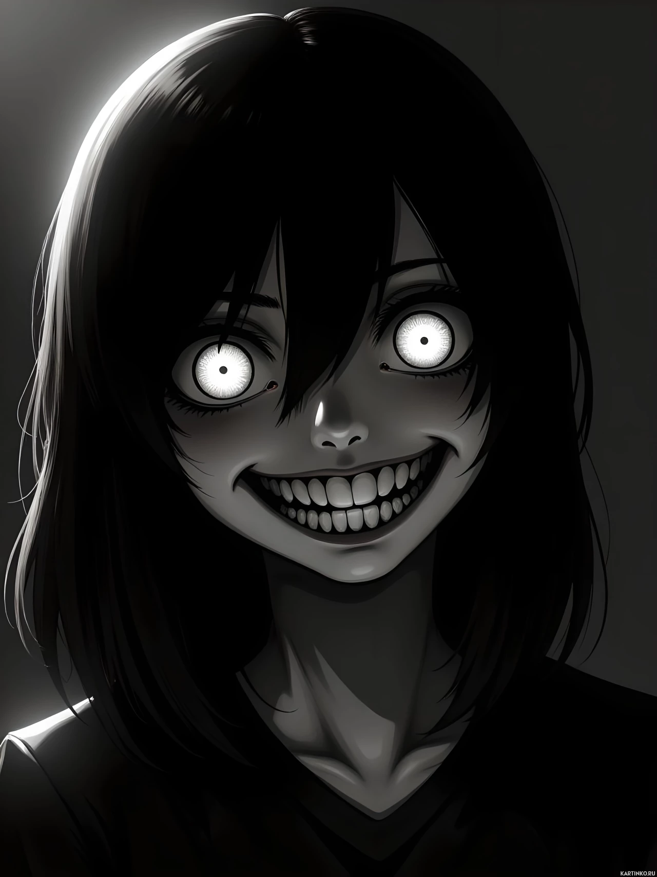 The image depicts a cartoon-style illustration of a girl with an unsettling grin, conveying