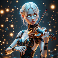 white hair and is wearing a black dress that appears to be made of some sort of shiny material, possibly leather or vinyl. She is holding the violin in her left hand and the bow in her right hand, and she seems to be lost in thought as she plays. The background of the image is dark blue, with small