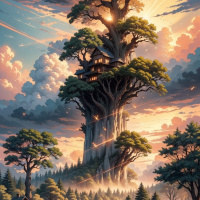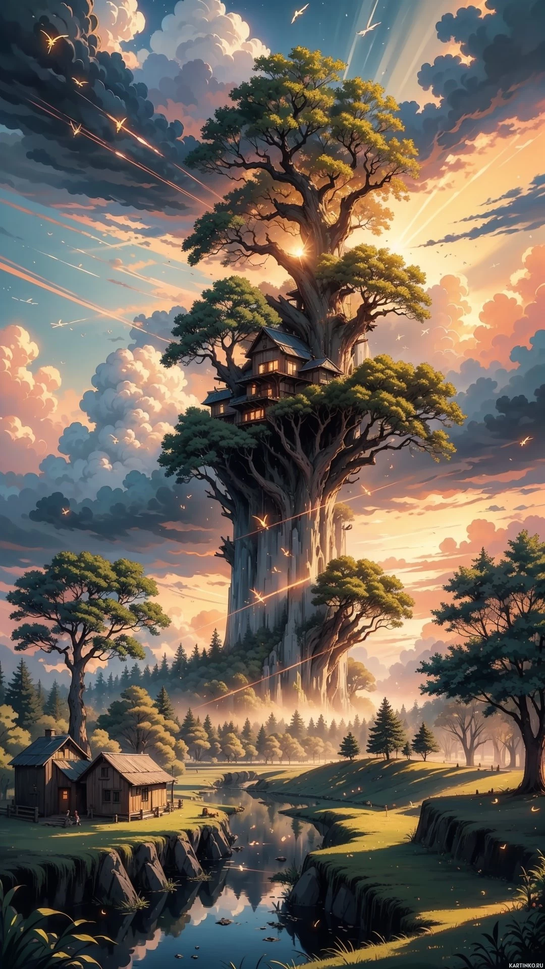 ancient tree that appears to be the centerpiece of the scene. This tree is surrounded by smaller trees and has several levels or platforms attached to its trunk. Above it, there are clouds and