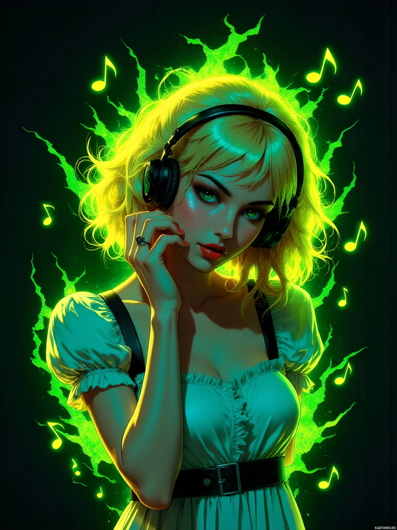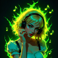 a black belt around her waist. * Her hairstyle appears to be wavy and loose, framing her face. * **Blonde Hair:** * The girl's hair is blonde in color. * It is styled in a way that frames her face and adds volume to her overall appearance. * **Headphone:** * The girl is wearing headphones around her head. * The headphones are black in color and have a sleek design. * They appear to be wireless, as there are no visible cords or wires attached to them. * **Music:** * The background of the image features musical notes and symbols. * These symbols are scattered throughout the image, creating a sense of movement and energy. * The music notes are depicted in a stylized manner, with bold lines and vibrant colors. In summary, the image depicts a young woman with blonde hair wearing headphones, surrounded by musical notes and symbols. The background of the image features a mix of blue and green hues, with musical notes and symbols scattered throughout.