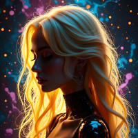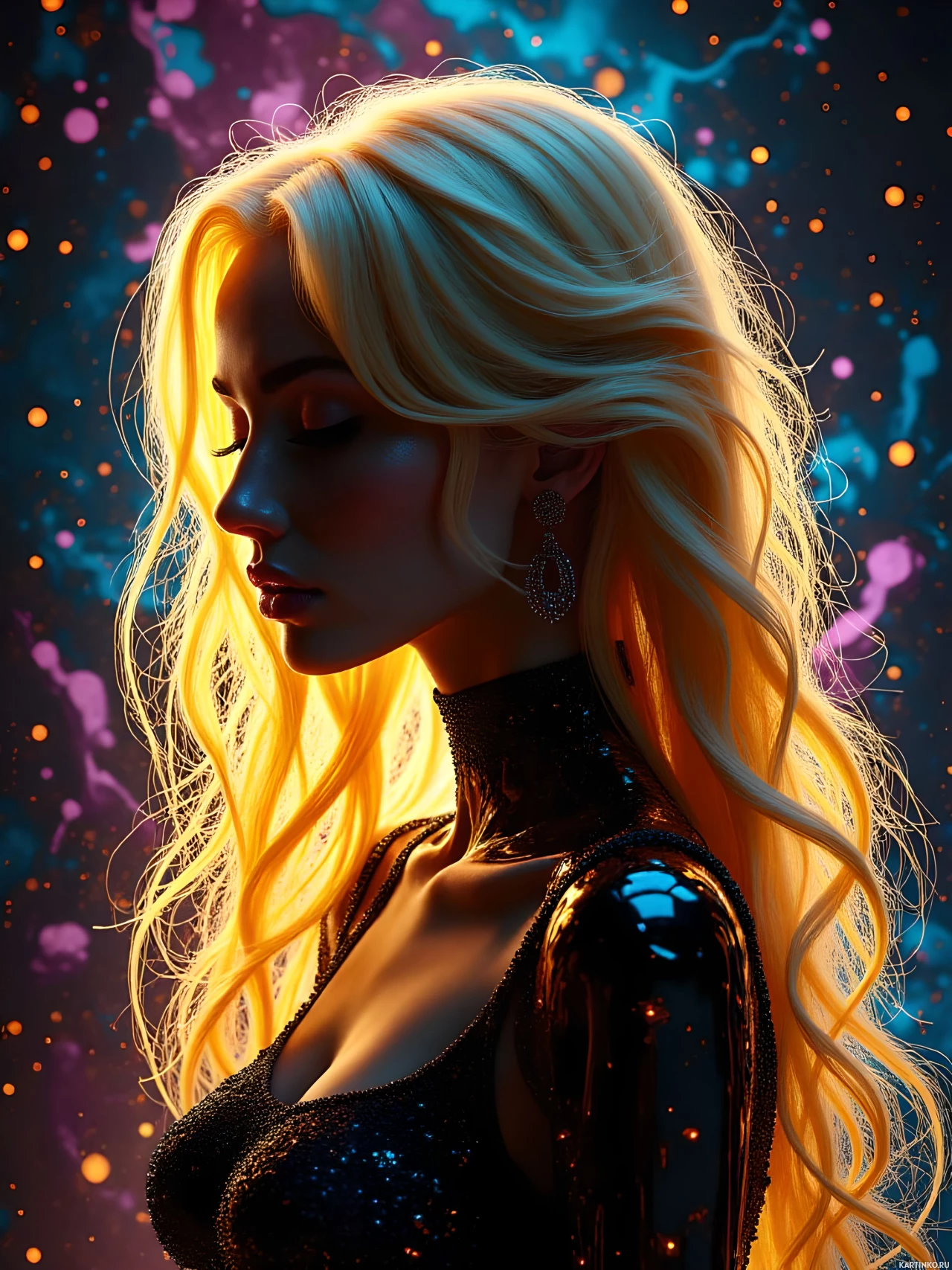 a black top or dress that appears to be made of a shiny material, possibly sequins or glitter. The background of the image is dark blue with pink and orange splatters, giving it a vibrant and eye-catching effect. The overall mood of the image is one of glamour and sophistication, suggesting that it may be used in a fashion or beauty context. The woman's pose and expression are relaxed and natural, conveying
