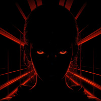 red lines radiating from behind her head, creating an otherworldly effect. The overall atmosphere suggests a mysterious or