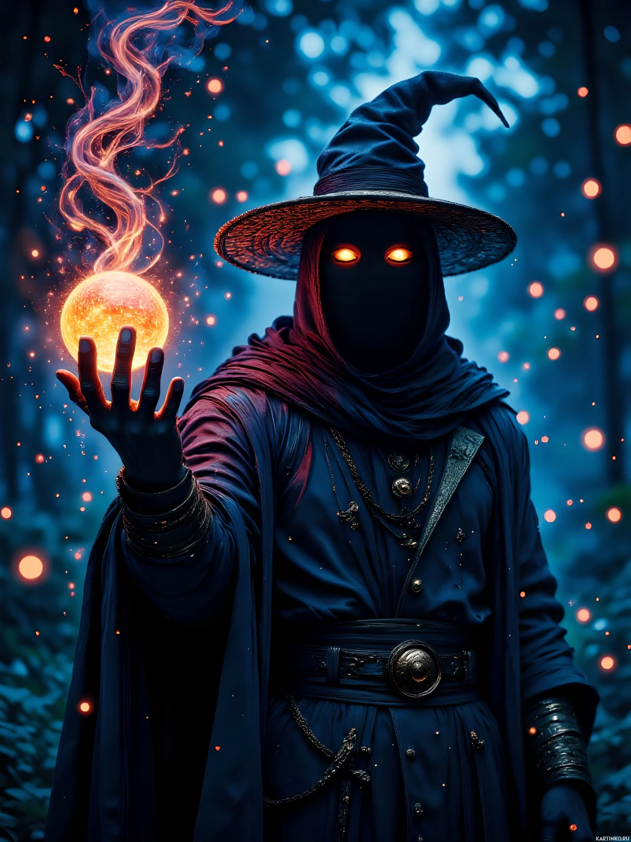 brimmed hat * **Hand:** + Right hand holding an orange orb suspended in mid-air * **Orb:** + Orange color + Suspended in mid-air The background is blurred, but appears to be a dark forest or woodland setting.