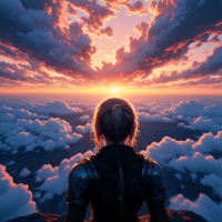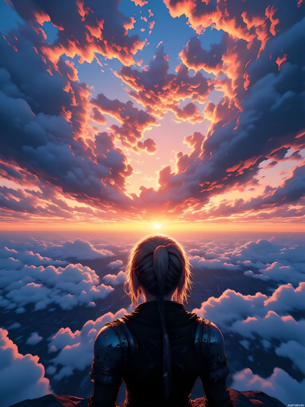 the edge of a cliff, gazing out at a breathtaking sunset. She is dressed in a long-