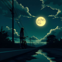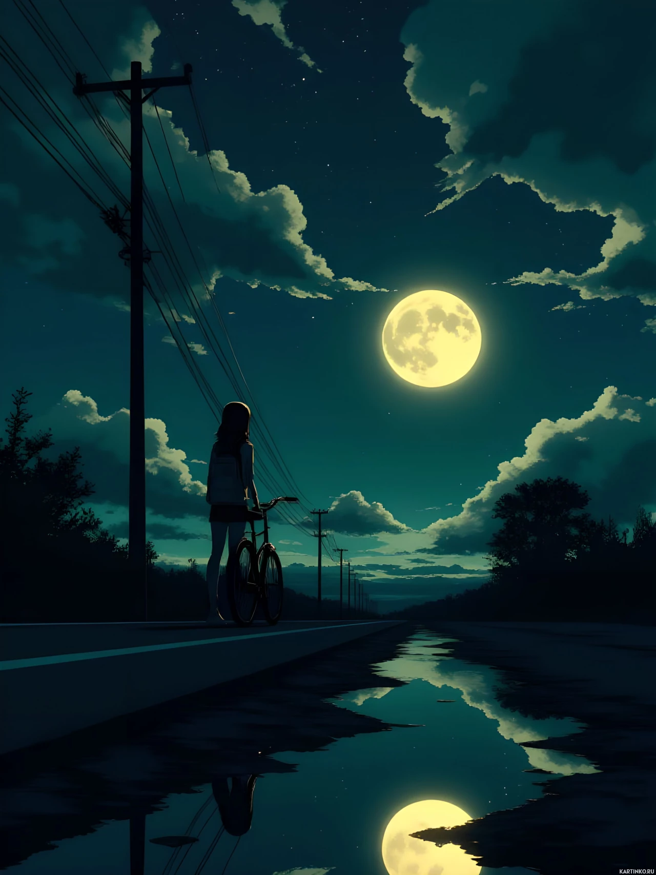 the soft glow of the moonlight. In the background, the road stretches out into the distance, lined with trees and power lines that cast