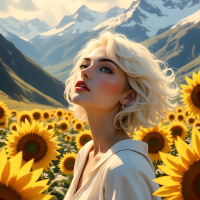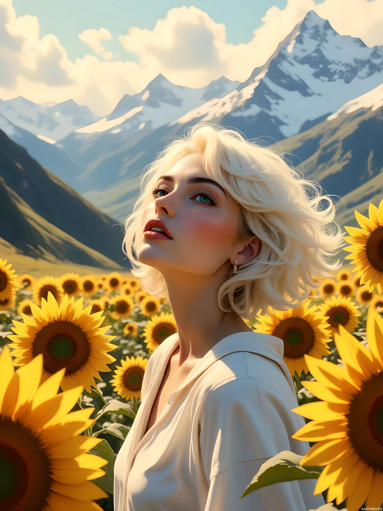 a young woman with white hair standing in a field of sunflowers, set against the backdrop of snow-capped mountains and fluffy clouds. The overall atmosphere is one of tranquility and