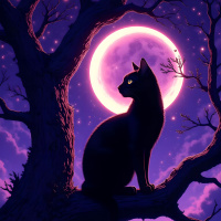 an otherworldly light over the entire scene. Its pale yellow color is reminiscent of old ivory or parchment, and its gentle illumination imbues the atmosphere with a sense of wonder and enchantment. The overall effect of this image is one of serenity and contemplation. The cat's calm demeanor and the peacefulness of the night sky create a sense of stillness that invites the viewer to pause and reflect on their own place in the world.
