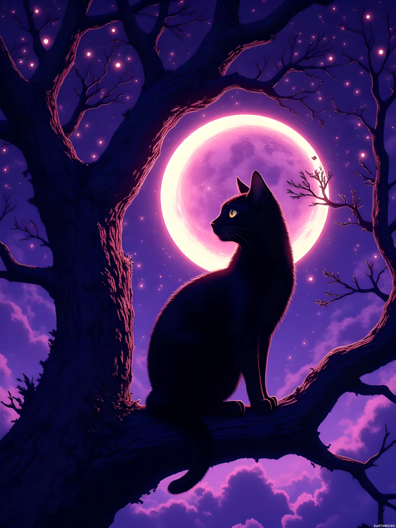 full Moon. The cat's sleek fur and piercing yellow eyes are illuminated by the soft, ethereal light of