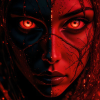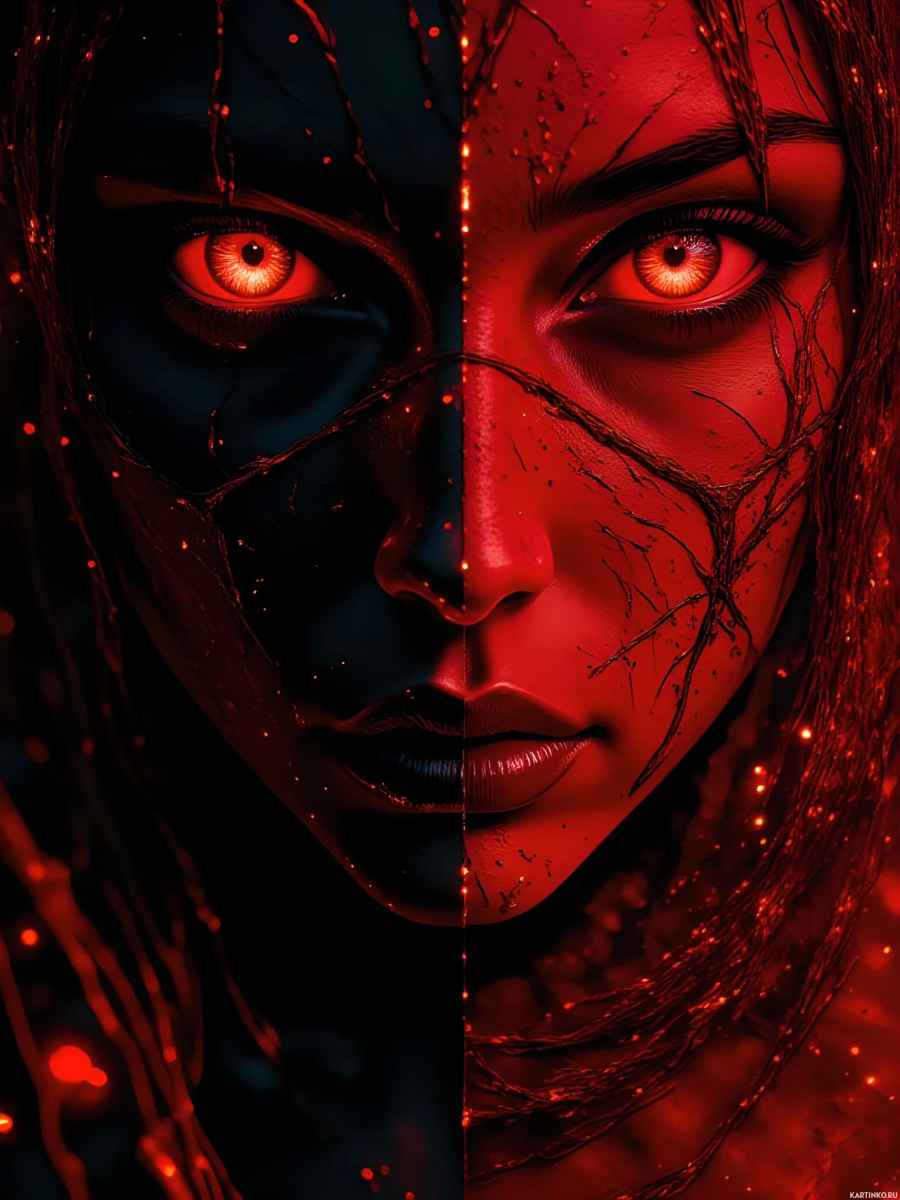 sense of mystery surrounding her presence. The background of the image is a deep black void, which serves only to accentuate the stark contrast between the two halves of her face. Overall, the image conveys a sense of duality and balance, as if the woman is embodying opposing forces or energies within herself. The use of black and red colors creates a dramatic and attention-grabbing effect, drawing the viewer's eye to the center of the image where the woman's gaze seems to pierce through the darkness.