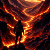 the lava flow, emphasizing the immense scale of the natural disaster unfolding before him. The use of warm colors and dynamic lighting creates a sense of tension and energy, drawing the viewer's eye into the heart of the action.