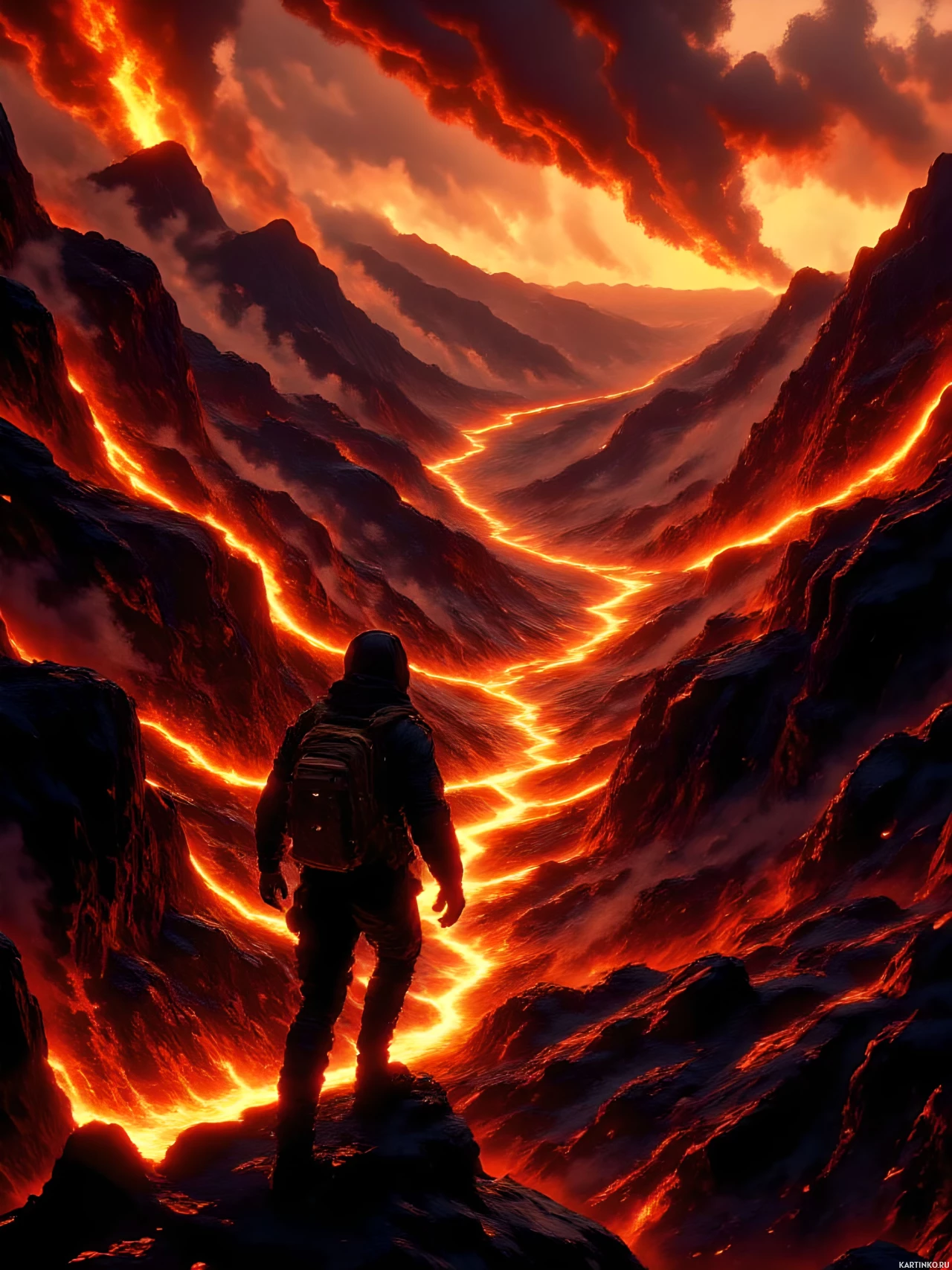 fiery landscape. The man is positioned in the foreground, facing away from the viewer and gazing out into the distance. He wears a backpack on his back and appears to be dressed in