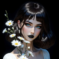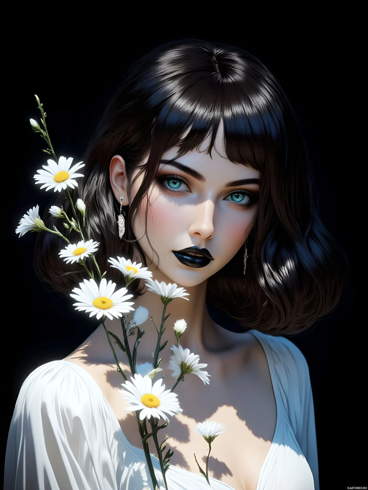 a white top and adorned with dangling earrings. The woman's gaze is directed towards the viewer, her expression soft and introspective. In front of her stands a bouquet of white flowers with yellow centers, adding