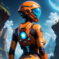 female character, set within a science fiction landscape. She is wearing orange and black armor, predominantly yellow in color, which includes a helmet with a visor that suggests high-