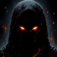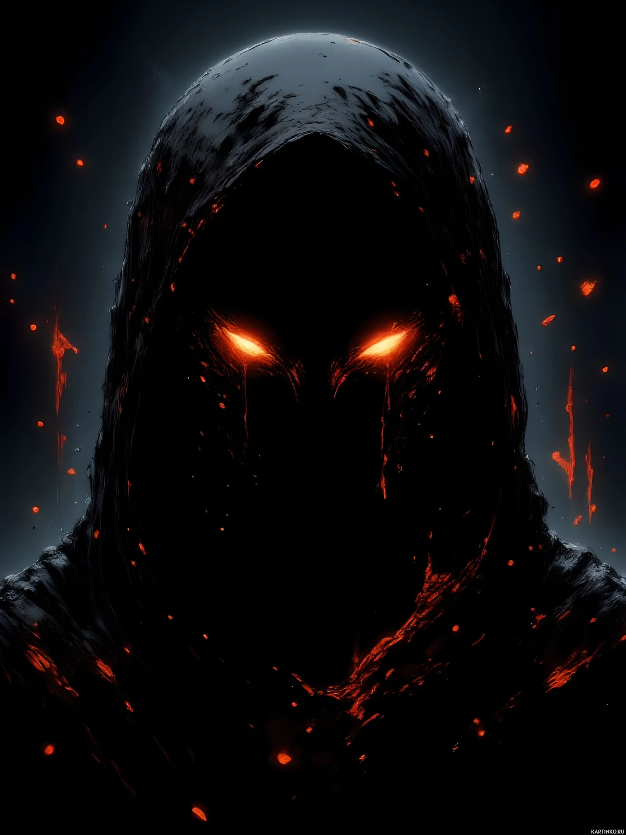 glowing eyes, set against a dark background. The figure is shrouded in shadows, with only its face visible. Its eyes are aglow with an otherworldly light, casting