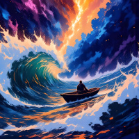 a mesmerizing display. The colors seem to be bursting forth from the clouds, as if they are being pulled out of the very fabric of reality. Overall, the image conveys a sense of drama and tension, as the man's small boat is dwarfed by the massive wave and the fiery sky above. It is a powerful reminder of the power of nature and the importance of being prepared for whatever challenges come our way.