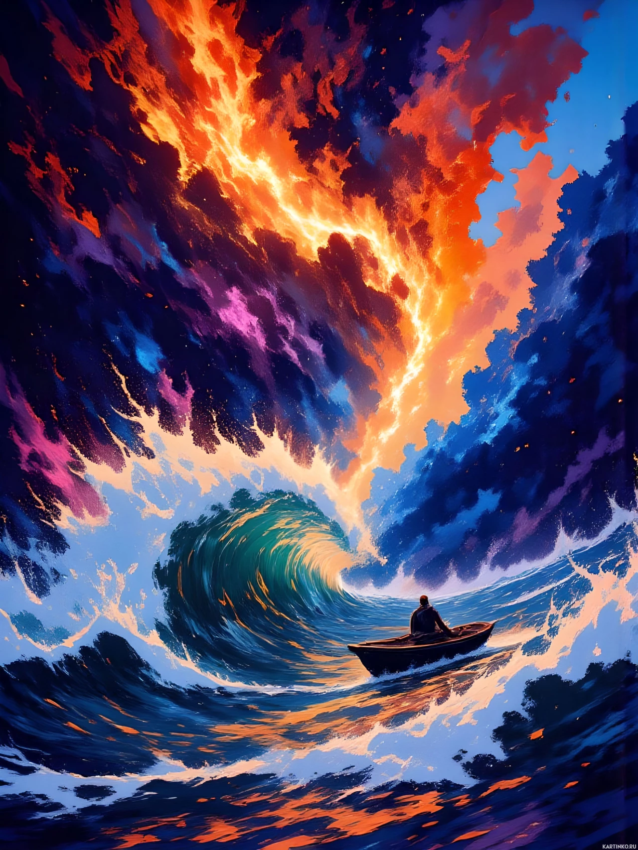 the fiery sky above. The wave appears to be towering over the man's boat, threatening to engulf it at any moment. The sky itself is a kaleidoscope of colors, with shades of orange, pink, purple, and blue swirling together in