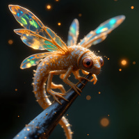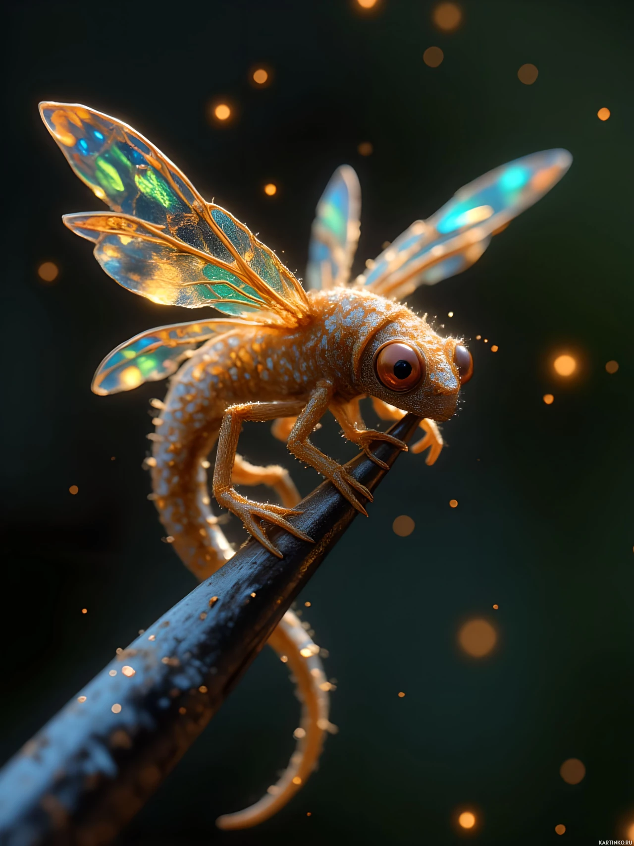 gold hue, while its eyes are large and round, reminiscent of those found on insects. Its wings display an iridescent quality, reflecting hues of blue, green, and yellow. The background of the image is dark and blurry, making it difficult to discern any specific details. However, the overall atmosphere suggests a fantasy or dreamlike setting, with the creature appearing as if it has been plucked from