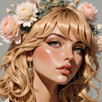 flower crown on her head, featuring pale pink flowers with green leaves. Her eyes are greenish-yellow in color, giving her an ethereal appearance. In the background of the image, there is