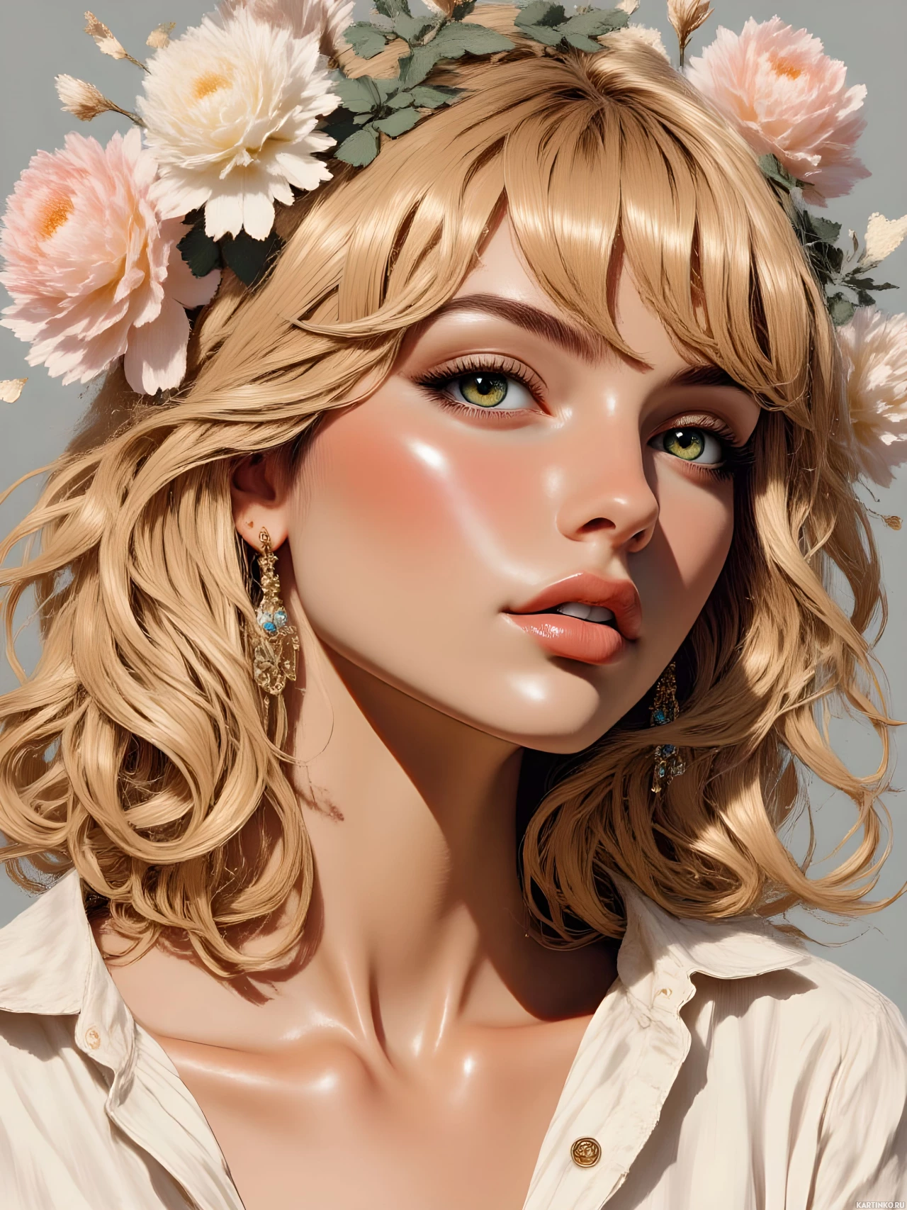 a young woman with long, wavy blonde hair that cascades down her back. She is wearing a white button-down shirt and has a delicate