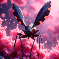dynamic movement and energy, despite the stillness of the image. In terms of composition, the fly is positioned centrally in the frame, drawing the viewer's attention immediately. The background is blurred, but it appears to be a mix of pink and purple hues, which adds to the overall sense of vibrancy and color.