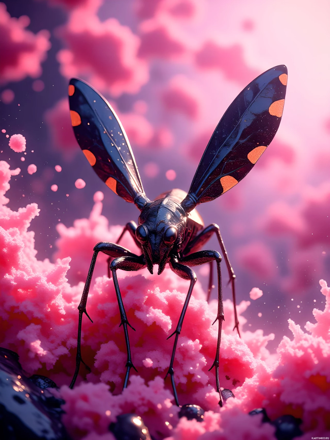 The image depicts a striking black fly with orange spots on its wings, standing in front of a vibrant pink and