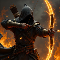 dark attire and armed with a bow and quiver of arrows. The archer is poised to fire an arrow, their body angled slightly to the left as they draw back the string. The background of the image features flames rising from rocks, suggesting that the scene may be set in a fantasy or