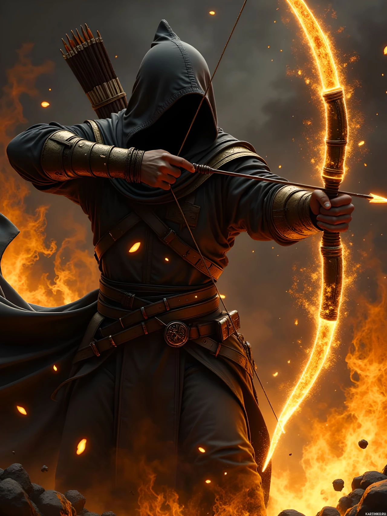 The image depicts a hooded archer, clad in