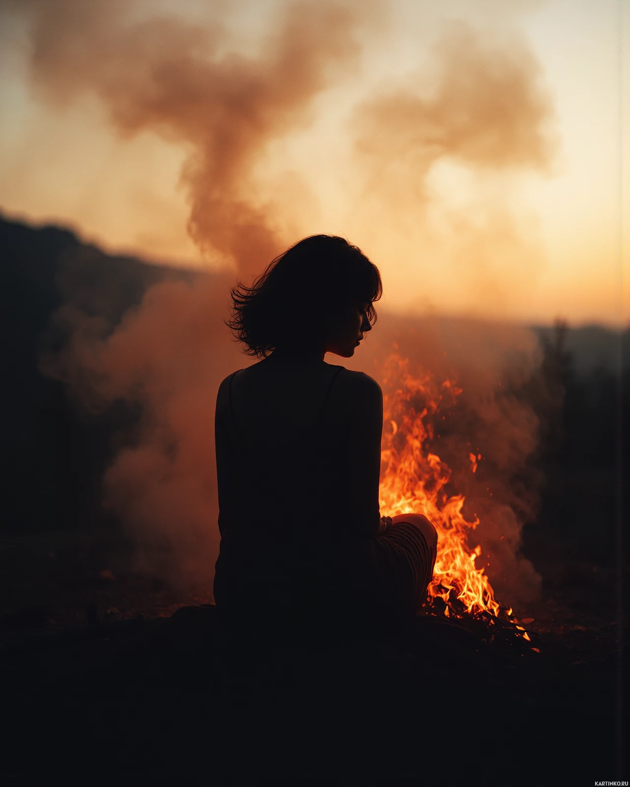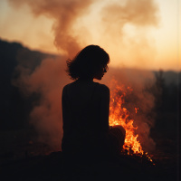 a silhouette of a woman sitting with her back to the camera, gazing towards the right side. The woman's hair is slightly tousled and appears to be blowing in the wind. In the background, flames are visible, although they do not appear to pose an immediate threat to the woman or anyone else in the vicinity. A plume of smoke rises from the fire, suggesting that it has been burning for some time. The sky above is hazy with smoke and ash, indicating a large-scale fire. The overall atmosphere of the image suggests that the woman may be taking refuge near the fire, possibly due to