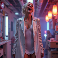 blonde hair, wearing a white leather jacket and a white tank top. The lighting in the image is dim, with