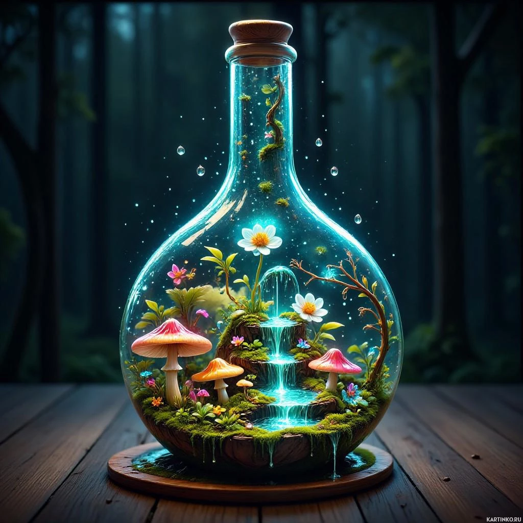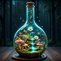 wooded area. The overall effect of the image is one of wonder and enchantment, as if the viewer has stumbled upon a magical world inside a bottle. The use of bright colors and intricate details adds to the sense of fantasy and adventure, making the image feel like a work of art rather than a simple photograph.
