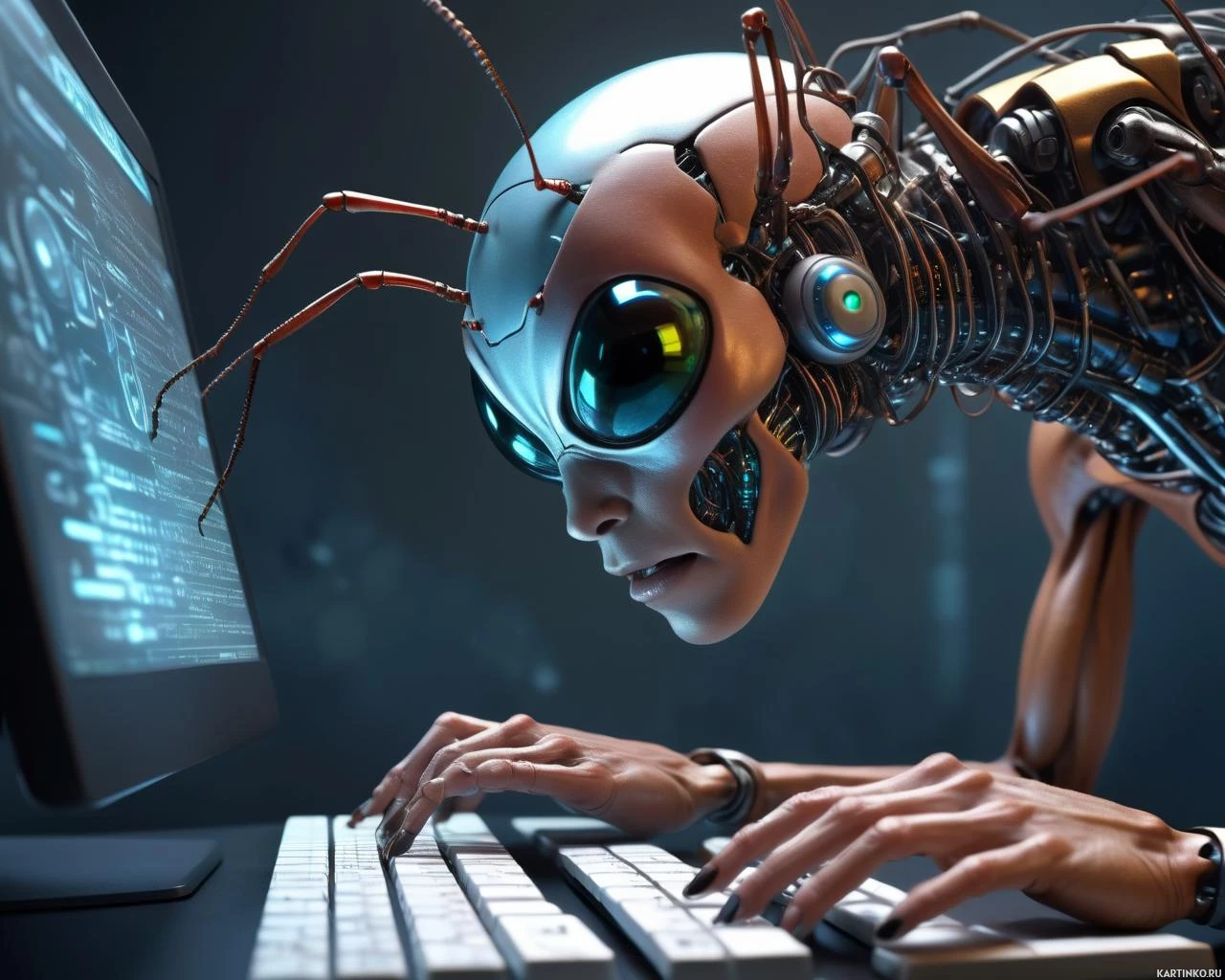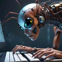 a circuit board connected by wires to the body, suggesting a connection between organic and inorganic systems. The robot is engaged with a laptop, which displays a complex interface with various digital elements, including lines of code and numerical data. This suggests that the robot may be involved in a task requiring technical skill or knowledge, such as coding, data analysis, or system administration. In the background, there are elements indicative of advanced technology and cybernetic integration. There's a wall with futuristic interfaces, possibly screens displaying additional information or controls for the robot's systems. The overall atmosphere is one of science fiction, where robots play an integral part in society and technology.