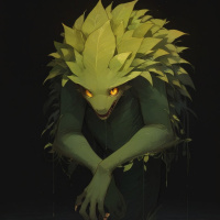 long arms and sharp claws, and its body is covered in leaves. Its eyes glow yellow, and it appears to be leaning forward, as if preparing to attack or defend itself. The background of the image is dark, suggesting that the creature inhabits a mysterious or foreboding environment. Overall, the image presents a striking and imaginative depiction of