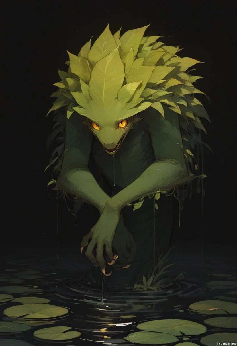 a fantastical creature with green skin and a plant-like head, surrounded by water. The creature has