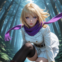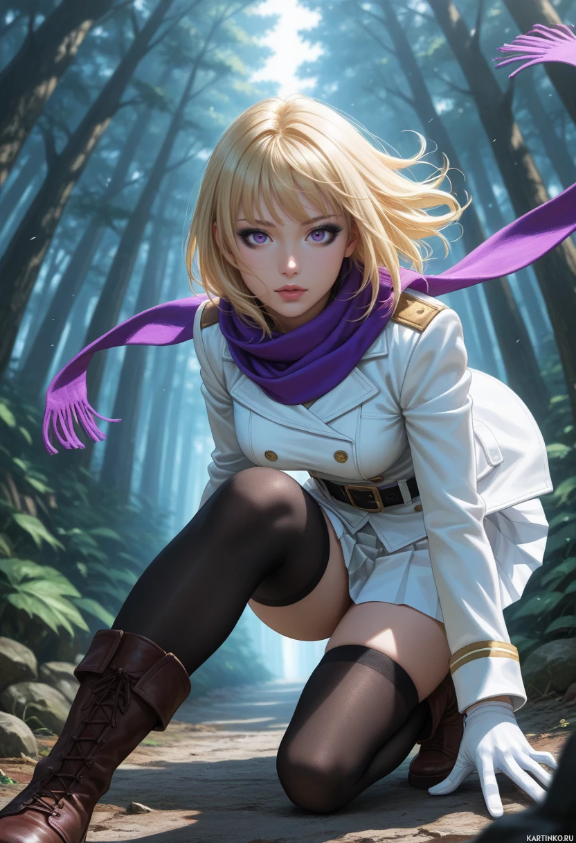 a young woman with blonde hair and purple eyes, dressed in a white jacket adorned with gold buttons and epaulets. She wears a vibrant purple scarf around her neck, complemented by black stockings and