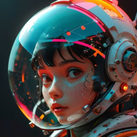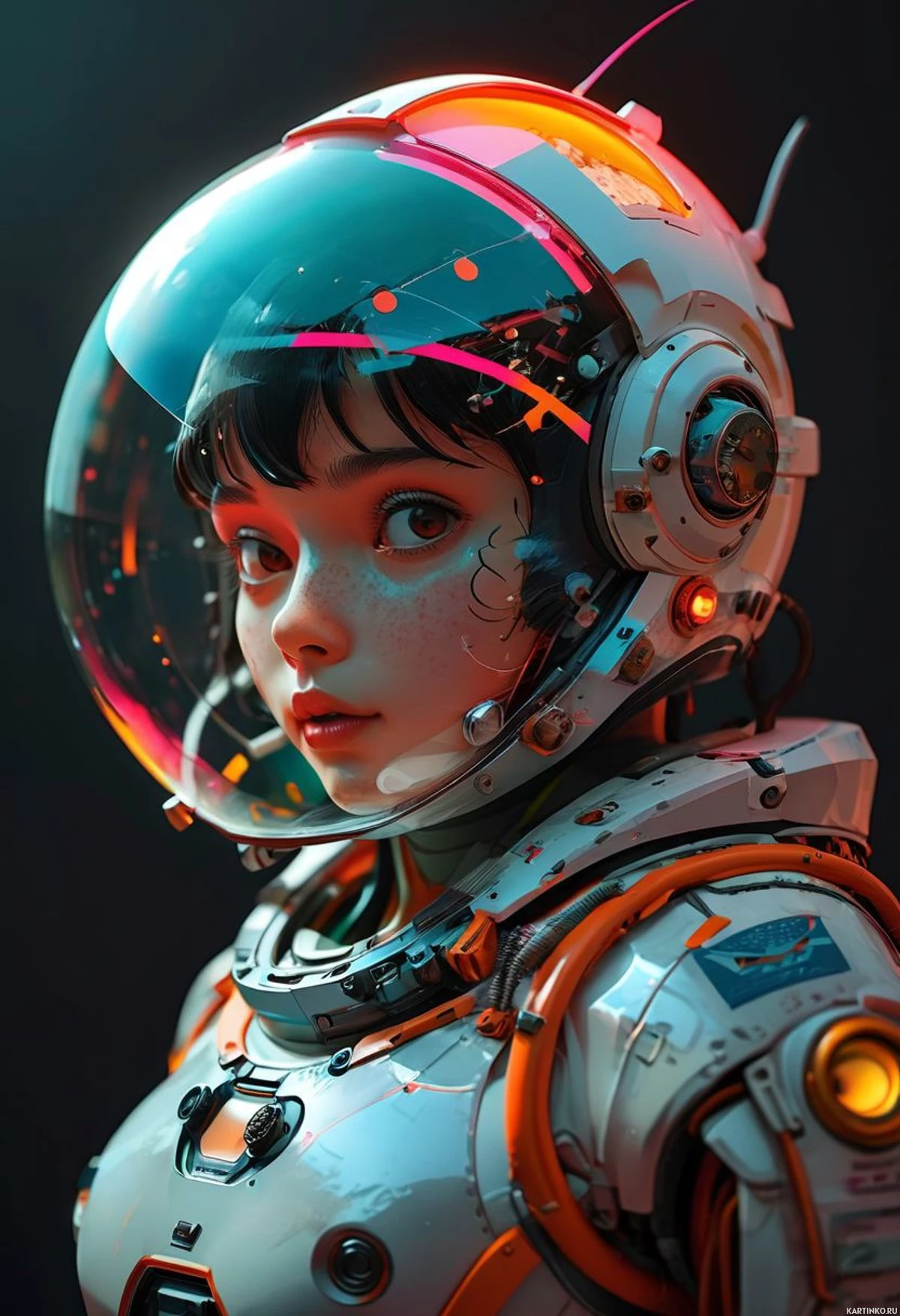 a space agency or organization. The background is dark and does not provide any additional context or details about her surroundings. The style of the image combines elements of realism with