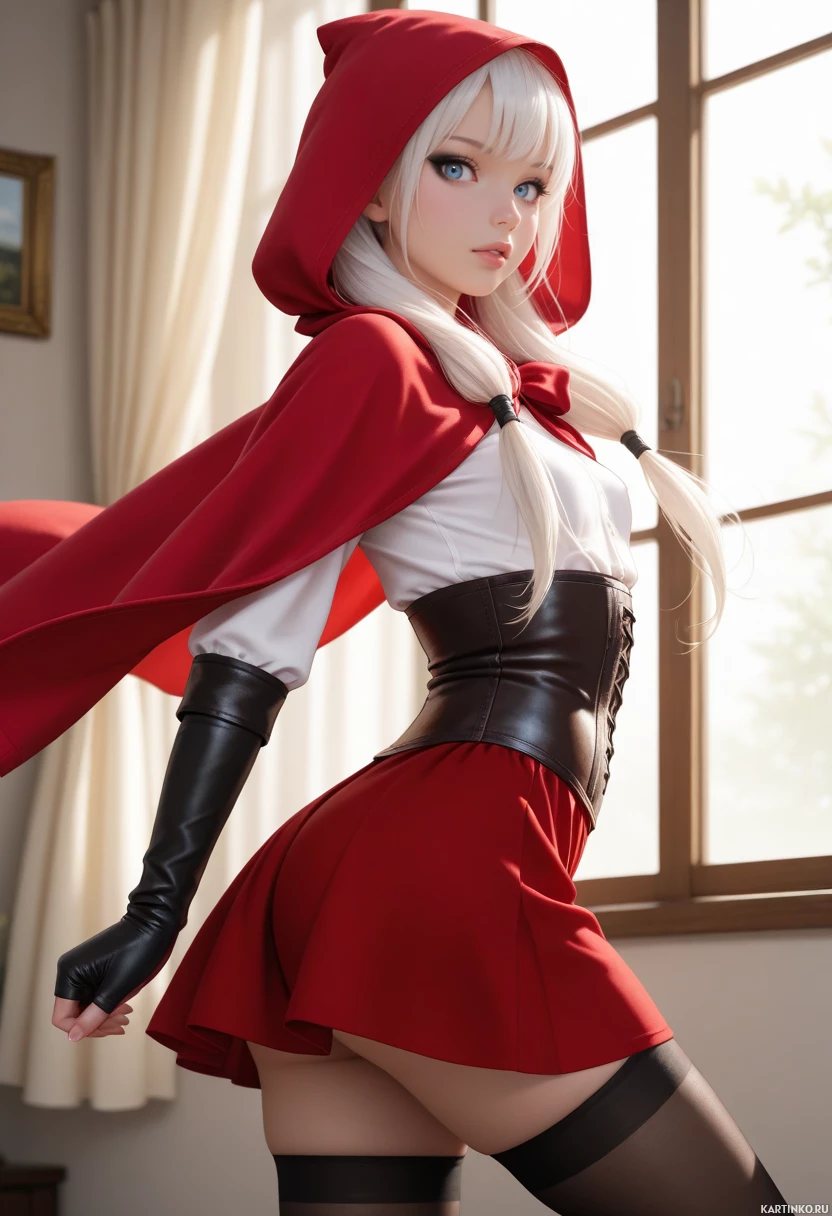 sense of mystery surrounding her character. The hood itself appears to be made of a lightweight material, allowing for a full range of motion as she moves about. In the background, a window with brown trim provides a subtle contrast to the vibrant red of the girl's cloak. A painting hangs on the wall behind her, adding a touch of elegance to the scene. The overall atmosphere is one of enchantment and wonder, inviting the viewer to step into the world of fairy tales and magic.