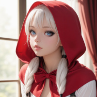 white hair styled in braids, wearing a red hooded cloak and a white dress. She is seated on the floor near a window, looking out at something outside. The atmosphere suggests that she may be waiting for someone or something to arrive. * **Girl** * Age: Young * Hair: Long, White * Eye Color: Not specified * Skin Tone: Not specified * Clothing: * Red