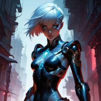 armor pieces and a metallic design. Her outfit is predominantly black with