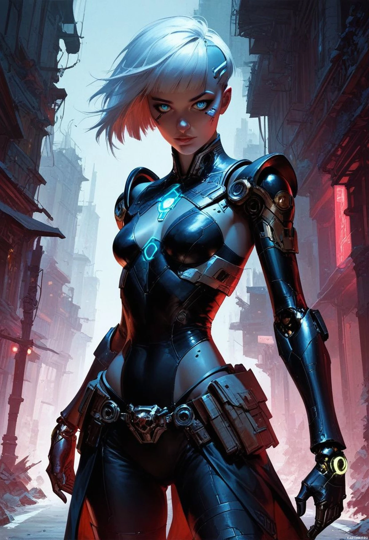 a female character with white hair. She is dressed in futuristic or science fiction attire, which includes