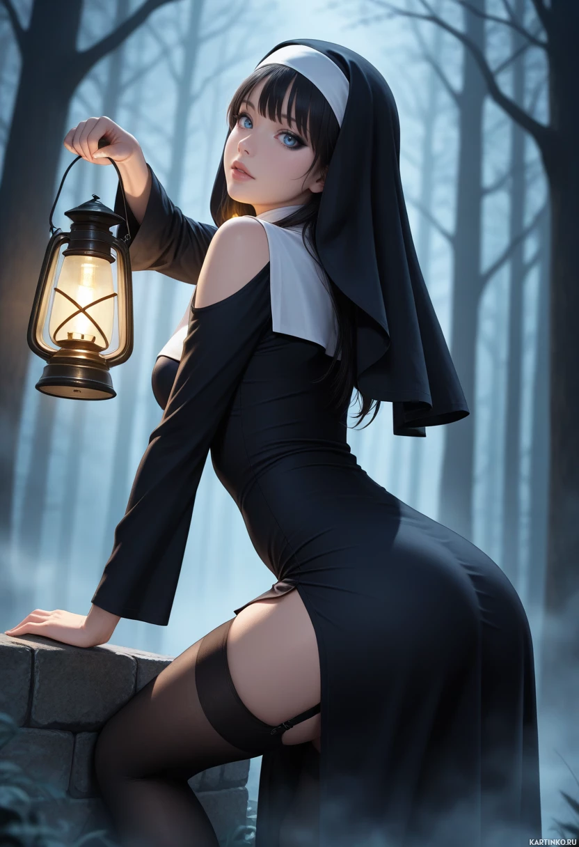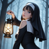 blue eyes, and is wearing a black habit with a white collar. The woman is holding a lantern in her right hand, which is suspended from her wrist by a strap. In the background of the image, there are trees and foliage visible through the mist. The overall atmosphere of the image suggests that it was taken on a foggy or overcast day, adding to