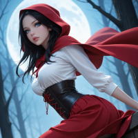 На картинке запечатлена молодая женщина в костюме Красной Шапочки, стоящая перед полной луной в лесу. У неё длинные тёмные волосы, на ней красный плащ с капюшоном, белая блузка и красная юбка. Образ дополняют чёрный кожаный корсет и чёрные колготки. На заднем плане – голые деревья и туманная атмосфера, создающая ощущение тайны и волшебства.