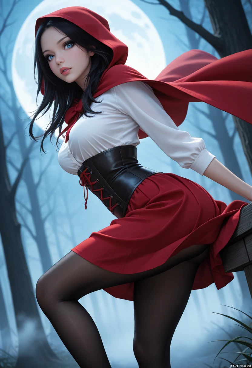 The image depicts a young woman dressed as Little Red Riding Hood, standing in front of a full moon in a forest. She has long dark hair and is wearing a red hooded cape over a white blouse and a red skirt. Her outfit is completed with a black leather corset and black stockings. The background features bare trees and a misty atmosphere, evoking a sense of mystery and enchantment.