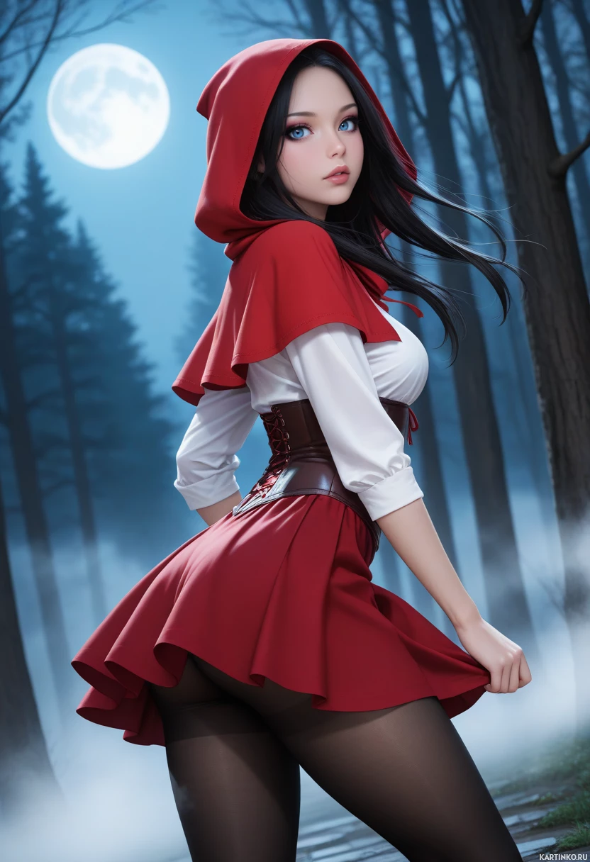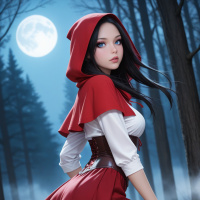 a young woman dressed as Little Red Riding Hood, standing in a forest with a full moon shining down on her. She has long black hair and