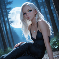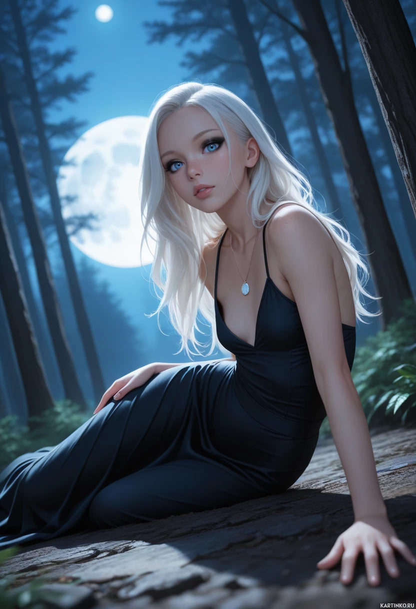a young woman with striking white hair, dressed in a flowing black dress, sitting on the forest floor under the soft glow of the moonlight. The atmosphere is tranquil, with