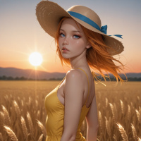 slender figure, showcasing her toned physique. As she stands amidst the golden wheat stalks, the warm sunlight casts a radiant glow on her face and body. In the background, the sun sets behind the mountains, casting a warm orange hue over the landscape. The overall effect is one of serenity and tranquility, as if the woman has stepped out of a dream into this idyllic setting.