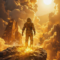a warm glow over the entire scene. The atmosphere is one of wonder and exploration, as if the astronaut has stumbled upon