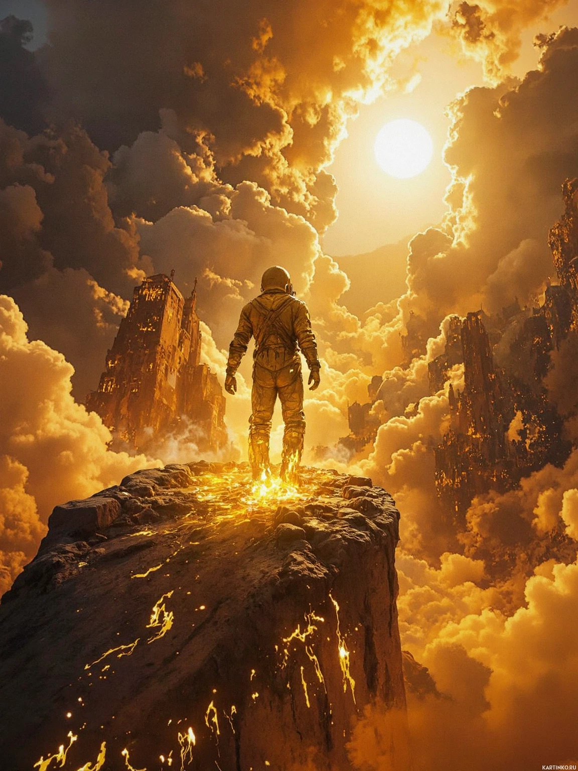 a science fiction scene featuring an astronaut standing on a rocky outcropping, gazing out at a vast expanse of clouds and sky. The astronaut is dressed in a spacesuit with a helmet, boots, and gloves, and appears to be surveying
