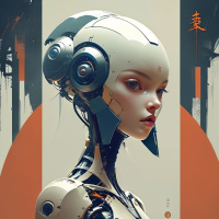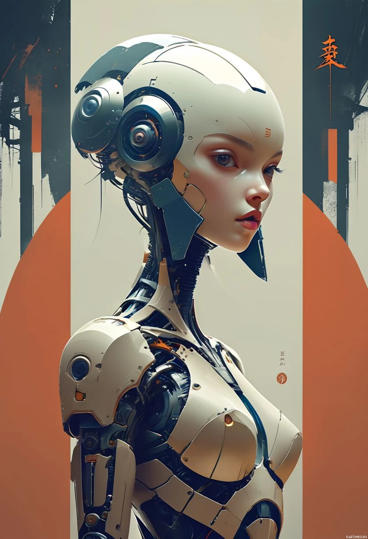humanoid robot. The robot has human-like features, including eyes, lips, and facial structure, with visible mechanical and electronic components indicating advanced