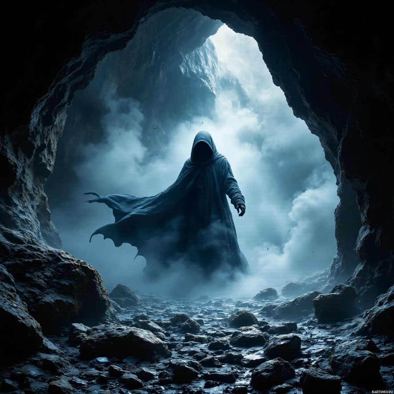 lit surroundings, their features obscured by the shadows cast by their hood. Their dark cloak billows behind them like a dark cloud, adding to the ominous
