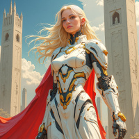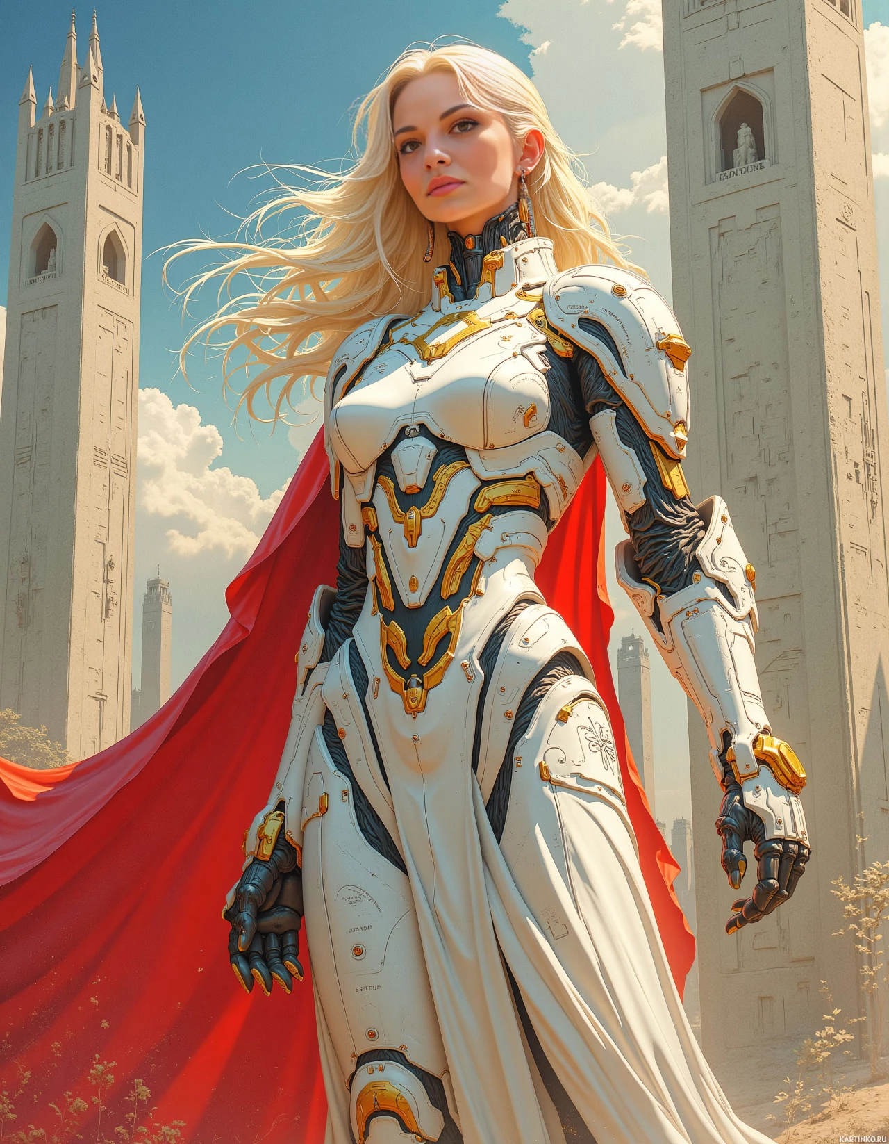 a blonde woman clad in white armor adorned with gold accents and a flowing red cloak. The armor is intricately designed, showcasing a mix of metallic and organic elements, while the cloak adds